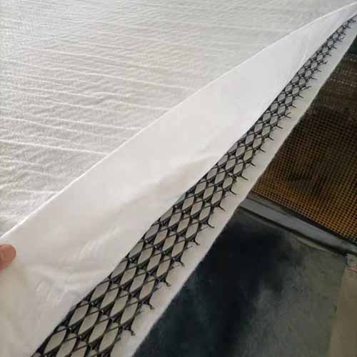 復合排水網是一種新型的排水土工材料。以高密度聚乙烯(HDPE)為原料,經特殊的擠出成型工藝加工而成,具有三層特殊結構。中間筋條剛性大,縱向排列,形成排水通道,上下交叉排列的筋條形成支撐防止土工布嵌入排水通道,即使在很高的荷載下也能保持很高的排水性能。雙面粘接滲水土工布復合使用,具有“反濾--排水--透氣--保護”綜合性能,是目前最理想的排水材料。